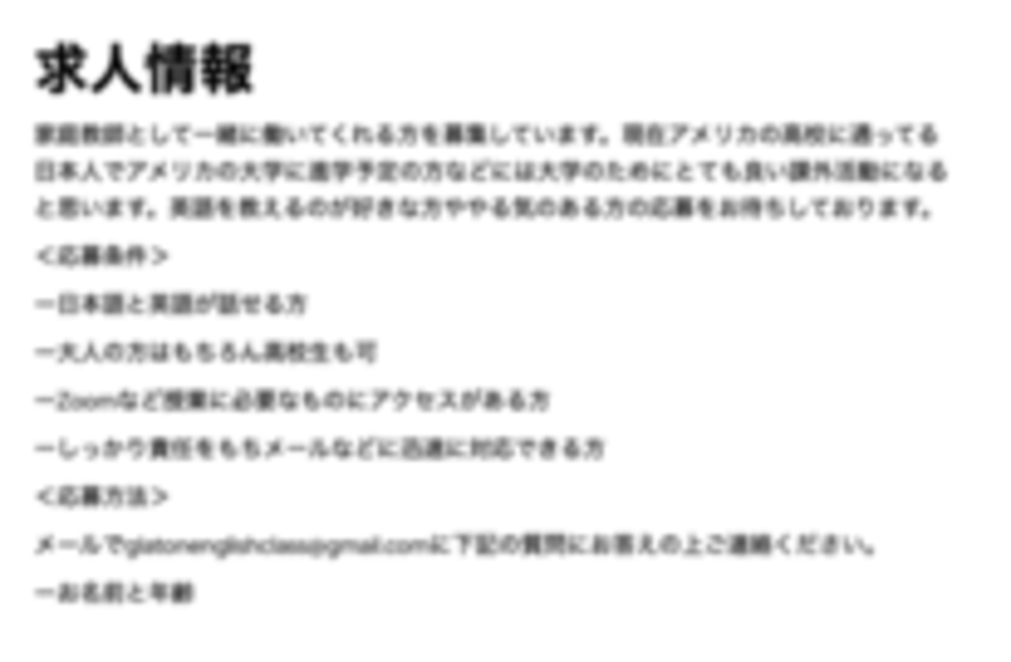 家庭教師として一緒に働いてくれる方を募集してます。現在アメリカの高校に通ってる日本人でアメリカの大学に進学予定の方などには大学のためにとても良い課外活動になると思います。