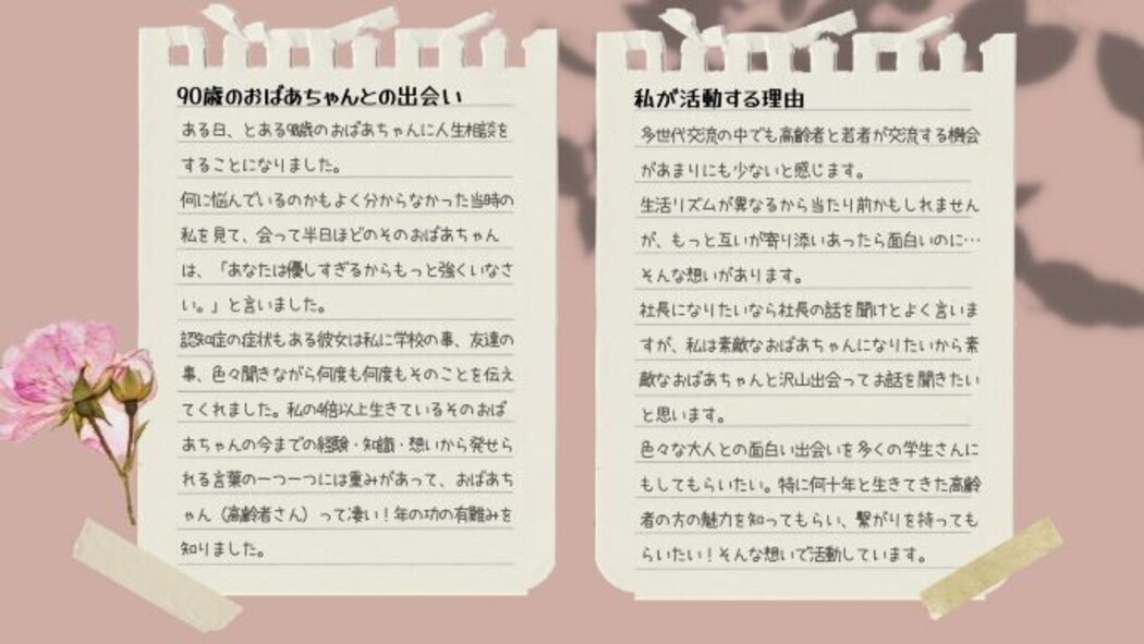 私の4倍以上生きているおばあちゃんが今までの経験・知識・想いからその言葉を伝えてくれているんだ。と考えると、発せられる言葉の一つ一つには重みがあって、おばあちゃん(高齢者さん)って凄い!と、おばあちゃんに対する見方が変わりました。