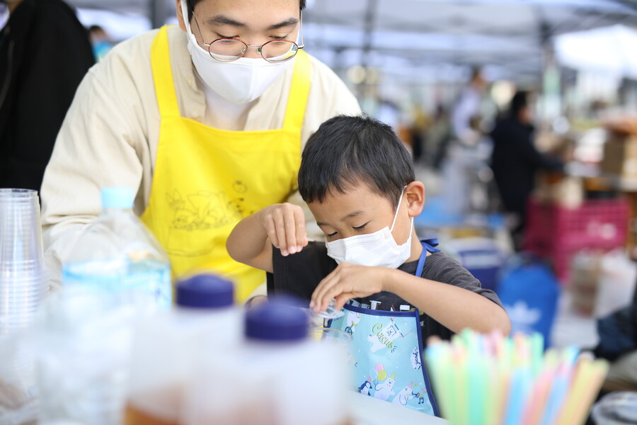 〇 地域の子ども食堂と、人気カフェに協力してもらい、子ども食堂にかかわる子ども達に、マルシェ内でレモネード販売体験をしてもらうブースを設置(子どもたちに地域のお店と繋がって体験の機会を提供するとともに、売り上げを子ども食堂に寄付)