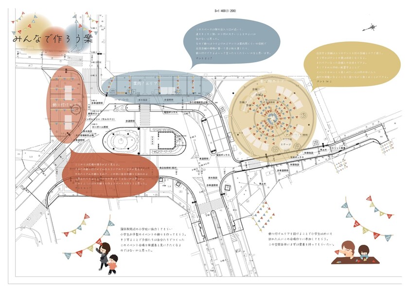 〇 大学・建築学科の建築家・学生に、マルシェ会場のレイアウト、会場からつながる商店街への導線確保などを目的にした配置設計をデザイン依頼。学生さんたちは、たんに机のうえでレイアウト設計をするのでなく、実際に会場や商店街などを実地調査し、提案。独創的なレイアウトは、地域の団体や行政からも高評価を得られました。