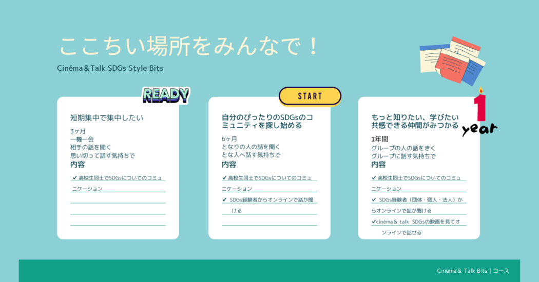 コミュニケーションを取りながら2023年春までに上映作品を決めて夏休みに上映会をします。