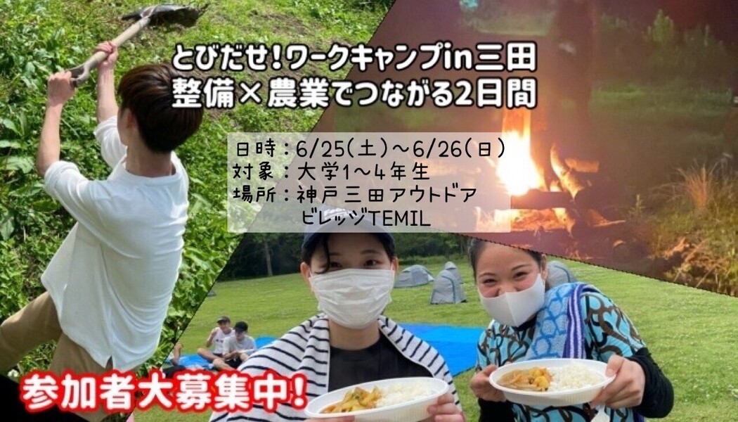 当イベントは、兵庫県三田市で1泊2日のボランティア体験。実施場所は山々に囲まれた自然豊かな場所。今回は農作業だけではなく、ペンキ塗りや施設清掃など普段経験することの出来ないキャンプ場の整備も行います。実際に現地で働いている人の手助けをすることで地域事業に貢献することの出来るイベントです。