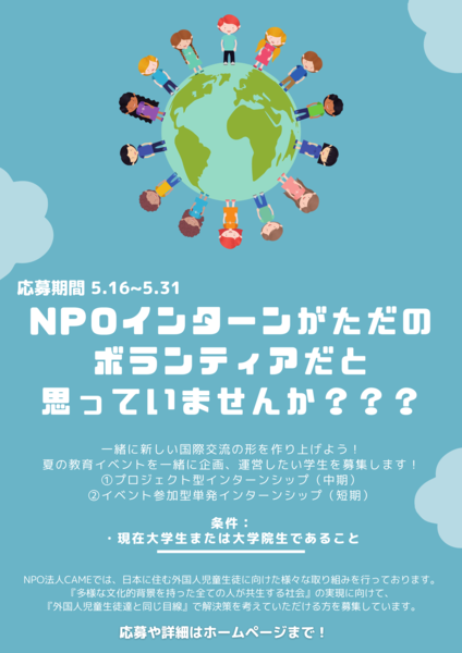 国際交流、子どもへのサポート、NPOでのインターンシップに興味のある方は是非応募を待っています!😊