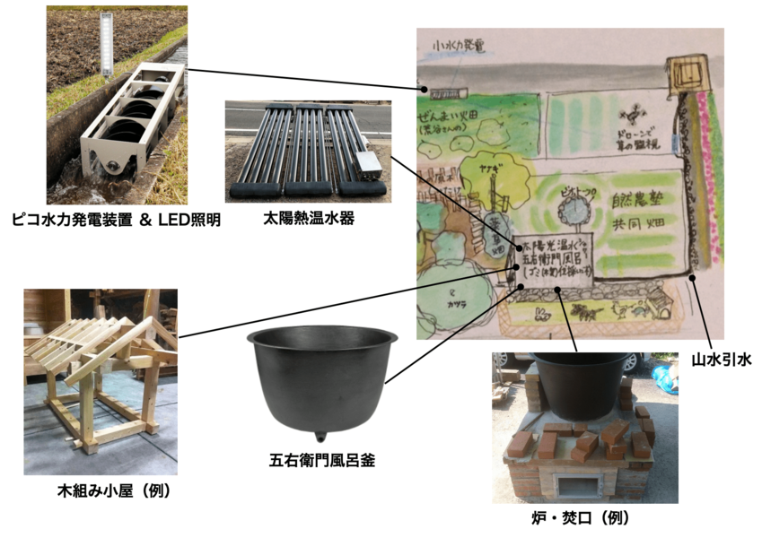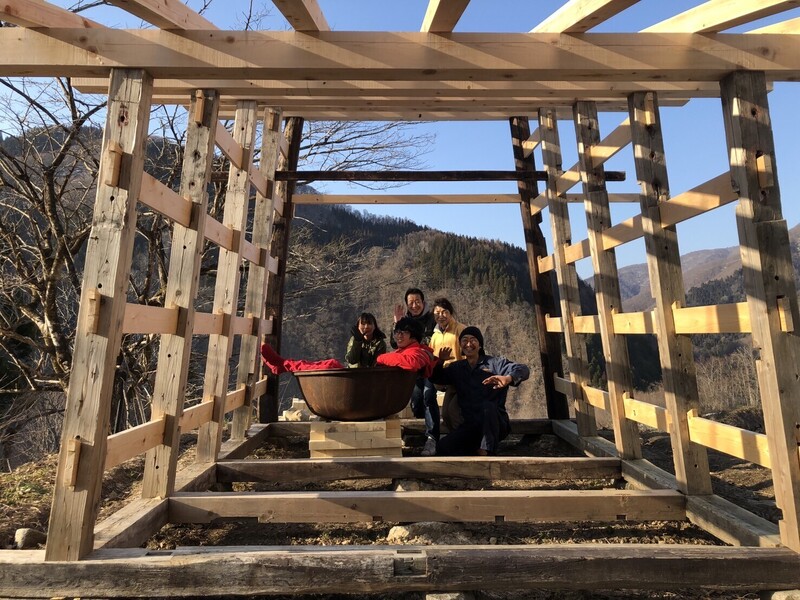 そんな自然豊かな種蔵地区で、昨年より訪れる皆さんの憩いの場として五右衛門風呂をつくるプロジェクトをスタートしました。山水を引き、太陽熱で水を温め、薪で焚き、自然エネルギー100%の五右衛門風呂を提供する予定です。また、里山が一望できる場所に設置するので眺望も良く、種蔵の自然の恵みをたっぷり感じられる癒しの場にしたいと思っています。そして、昨年たくさんのヒダスケさんにお手伝いしていただき、五右衛門風呂の小屋があらかた出来上がりました!次は、ついに五右衛門風呂本体の炉づくりに入ります!