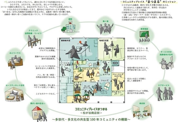 ・2021年3月にまず松が谷にて地域住民のみなさんに説明会を開催、以降、毎月1回「住民参加型学習会」と開いてきました。拠点をつくる場所はスーパーが撤退し、9年にわたりシャッターが下りていた300坪の店舗です。「健康維持室」「地域交流室」「コミュニティカフェ」「ショップ(物販)」「惣菜製造・販売」「子どもの居場所」「総合相談窓口」「カルチャー室」を整備する計画です。年明けに着工。オープンは7月23日の予定です。