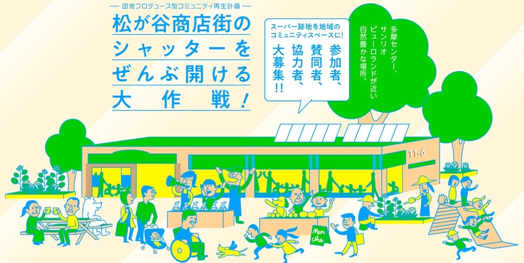 ・入居開始から50年がたった多摩ニュータウン。かつては憧れだった団地も少子高齢化が進み、商店街は疲弊し空き店舗が増え、将来に不安を抱える人たちが増えています。私たちコミュニティネットワーク協会はこのプロジェクトで松が谷住宅にある空き店舗を活用して共生型の交流拠点をつくり、これをコミュニティ再生のモデルにするとともに、次世代を担う人材も育成しようとしています。