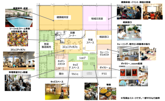 ・子どもから高齢者まで、障がい者も外国人も共に集う、持続可能な共生型の交流拠点です。「食べる・遊ぶ・運動する・学ぶ・働く・相談する」などの機能が入ります。