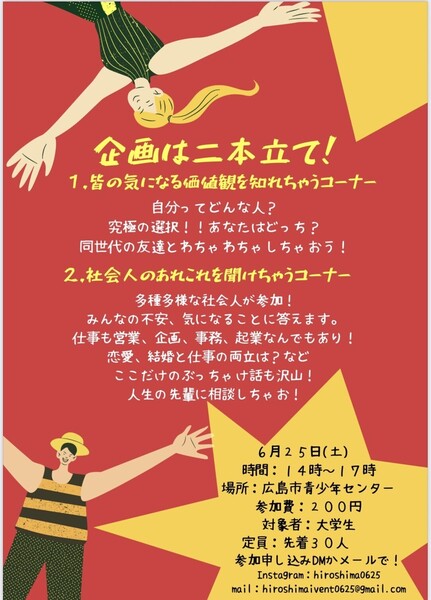 4年生就職活動中です。大学では「宮島てらこや」というボランティアサークルとバレーボール部を掛け持ちしています。大学最後の年を就職活動だけに充てるのはもったいないと思い、今回のイベントを企画しました。