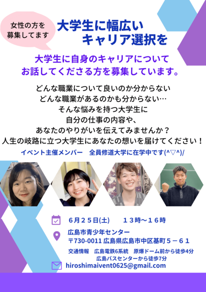 そんな大学生たちにキャリアがある方は、自分の仕事を選んだ理由や仕事のやりがい、また、今回は女子大学生が多く参加するため、子育てのリアルや、仕事を持ってらっしゃる方は家庭との両立の仕方についてお伝えしてほしいと考えています。