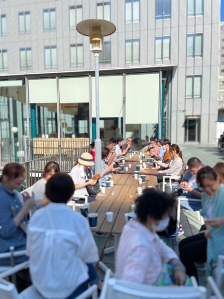 終わってカフェに参加される人数も増えてきたので、オープンテラスで開催。