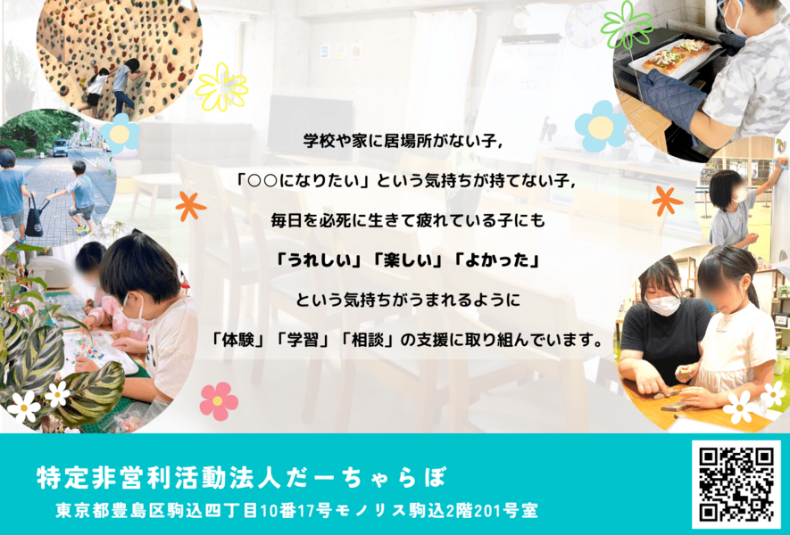 だーちゃらぼは、東京都豊島区で不登校生のためのフリースクール「だーちゃ」の運営を中心に活動しているNPO法人です。「だーちゃ」とは別荘という意味で、みんながのびのびと心のエネルギーを蓄えられる居場所にしたいという想いから名づけました。