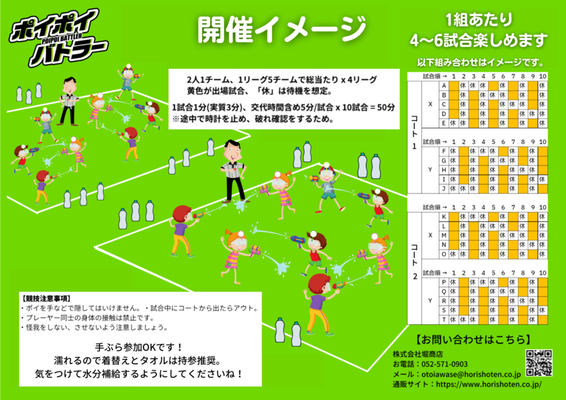 リーグ内では5組の内、4組が同時にコートに入り制限時間内で対戦相手チームのポイを水鉄砲で狙います。