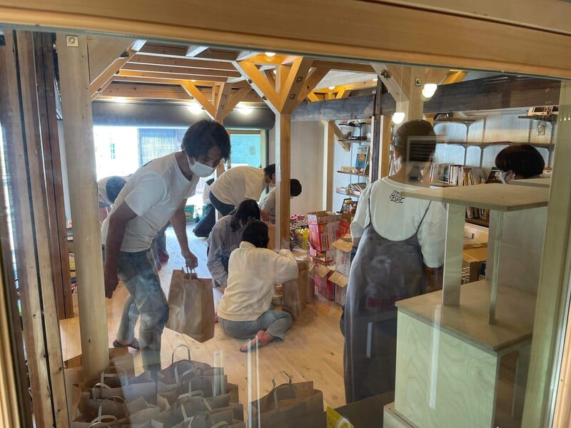 - 缶詰やレトルトなどの保存がきく食材を、世帯ごとの袋に分けたり、受け渡ししたりします。