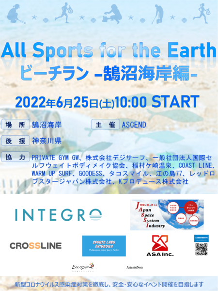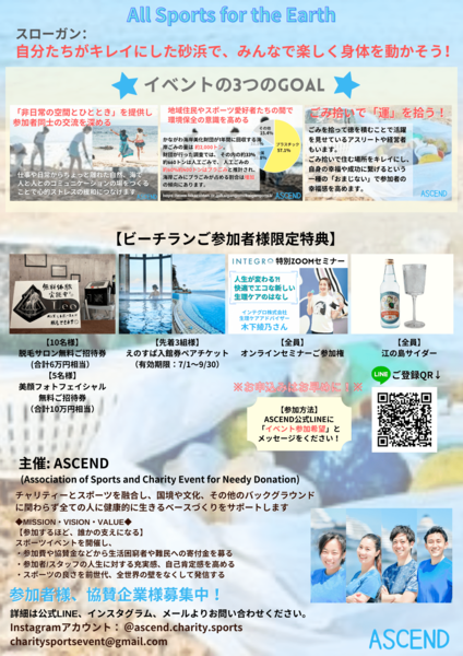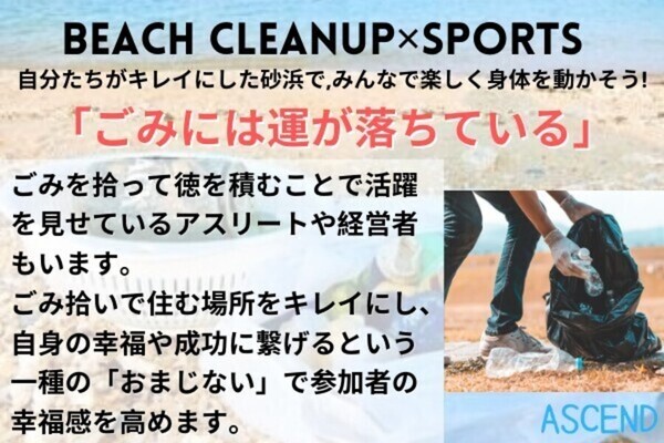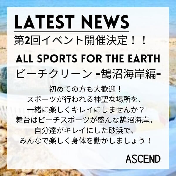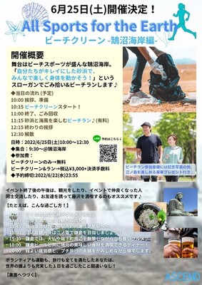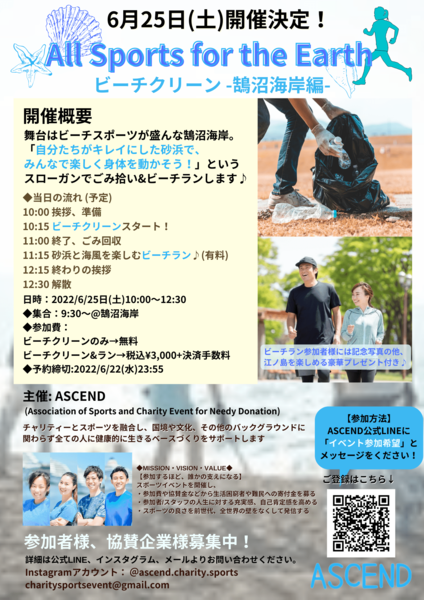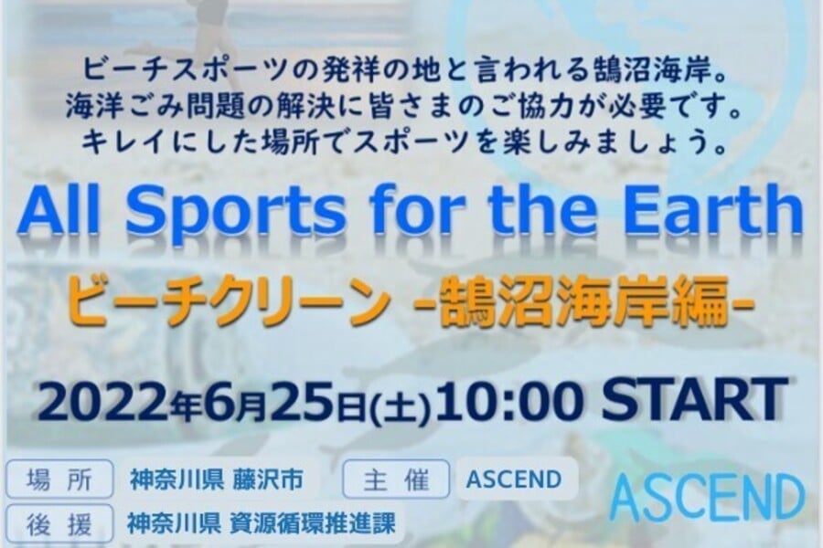 2022年6月25日(土)、神奈川県藤沢市の鵠沼海岸にて、「ASCEND(Association of Sports and Charity Event for Needy Donation)」が「All Sports for the Earth ビーチクリーン -鵠沼海岸編-」を開催します。