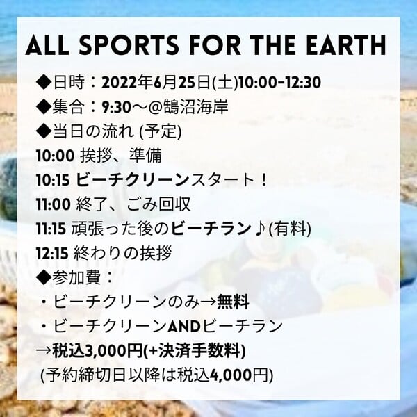 【開催まであと22日!参加者募集中!】<6/25>「All Sports for the Earth ビーチクリーン -鵠沼海岸編-」鵠沼海岸(神奈川県藤沢市)にて開催!