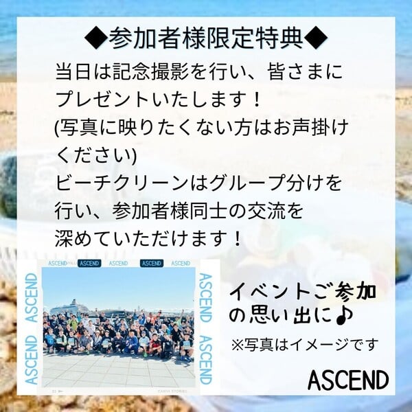 砂浜のゴミ拾いや、ビーチランなど、皆さまが当イベントに参加して良かったと思えるよう、心を込めてイベントを企画、運営させていただきます!