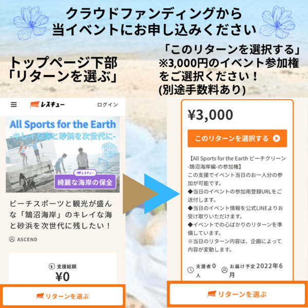 メッセージを確認次第、ご予約フォームをご送付させていただきますので必要事項をご記入いただき、ビーチランのご参加者様のみ、クラファンサイト「レスキュー」への参加費のお支払いが確認でき次第、ご予約完了となります。