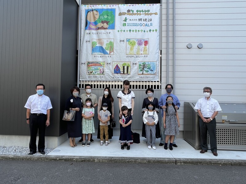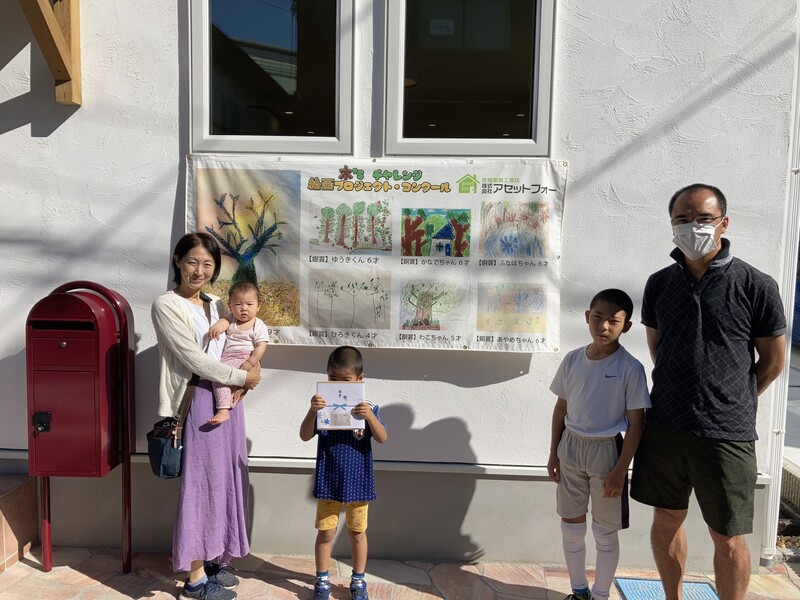 自分の絵が表彰されて誇らしげな子どもさん、それを見て嬉しそうな親御さん、おじいちゃん・おばあちゃん、囲んでいる建築会社の社員さんたちもつられて笑顔になる、そんな雰囲気です。