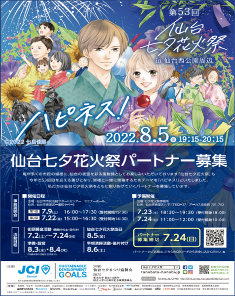 毎年多くの市民の皆様に、仙台の夜空を彩る風物詩としてお楽しみいただいております「仙台七夕花火祭」も、今年で53回目を迎える運びとなり、皆様と一緒に開催する ためテーマを「ハピネス!」といたしました。私たちは仙台七夕花火祭をともに創りあ げていくパートナーを募集しています。