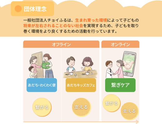 一般社団法人チョイふるは、「生まれ育った環境によって子どもの将来が左右されることのない社会」を実現するため、3つの事業を実施しています。