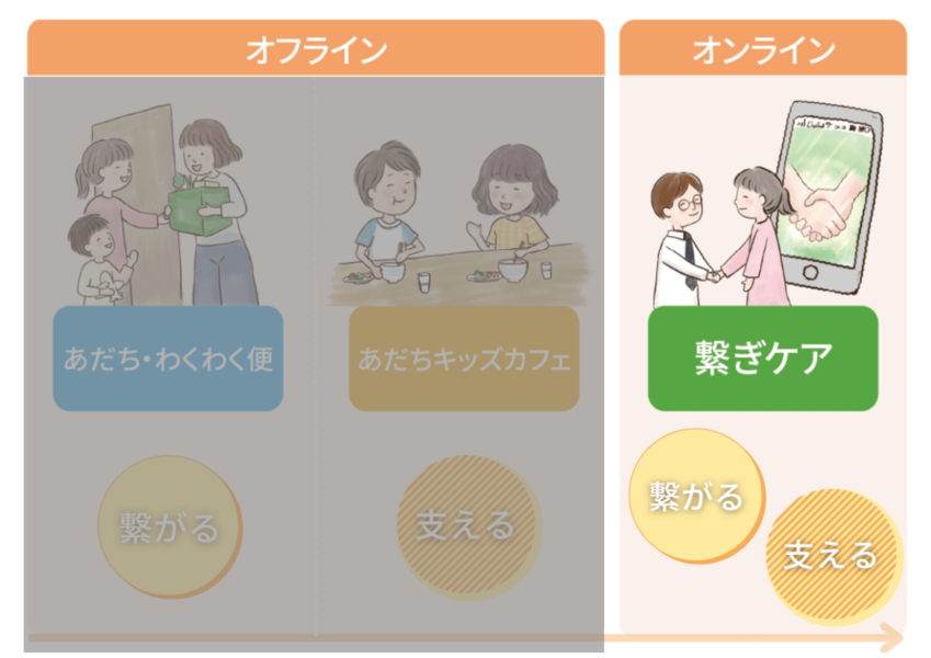 「繋ぎケア」では、チラシやLINE等で必要な子育て支援情報を届け、親子の悩みに寄り添いながら必要な支援に繋ぐ活動です。