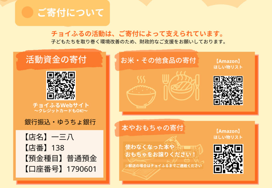 一般社団法人チョイふるは、「生まれ育った環境によって子どもの将来が左右されることのない社会」を実現するために、子どもを取り巻く環境をより良くするための活動を行っています。