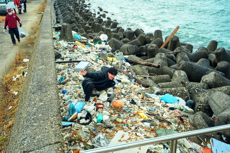 メンバーのみんなと川に赴いて、大量のゴミを回収します。