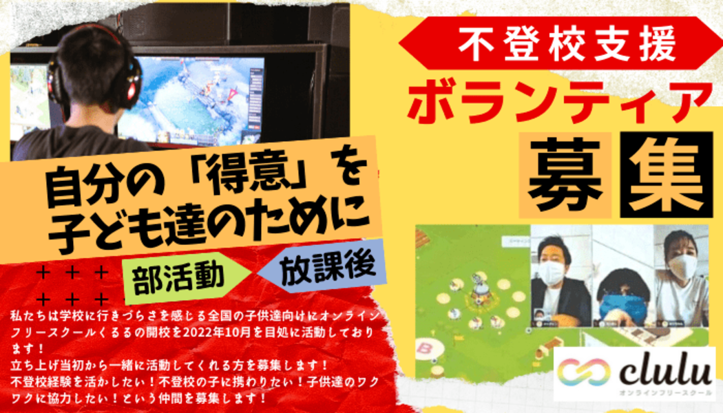 はじめまして。オンラインフリースクールcluluボランティアスタッフ募集ページになります。