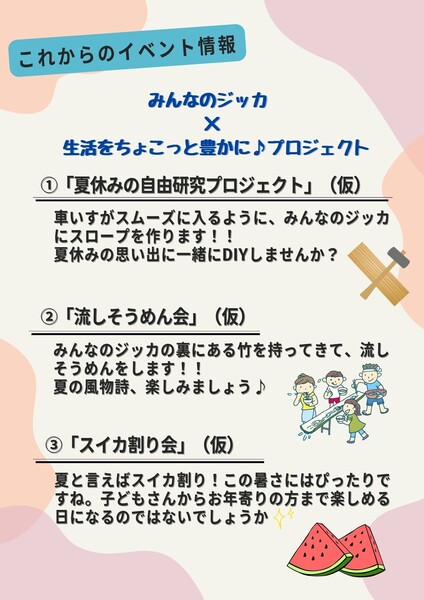 七夕ミニイベントを開催します!隣接している保育園のお子さん・お母様・お父様や近所のご高齢者さんが訪れて、一息ついて帰ってもらう。そんな場所を作ります!