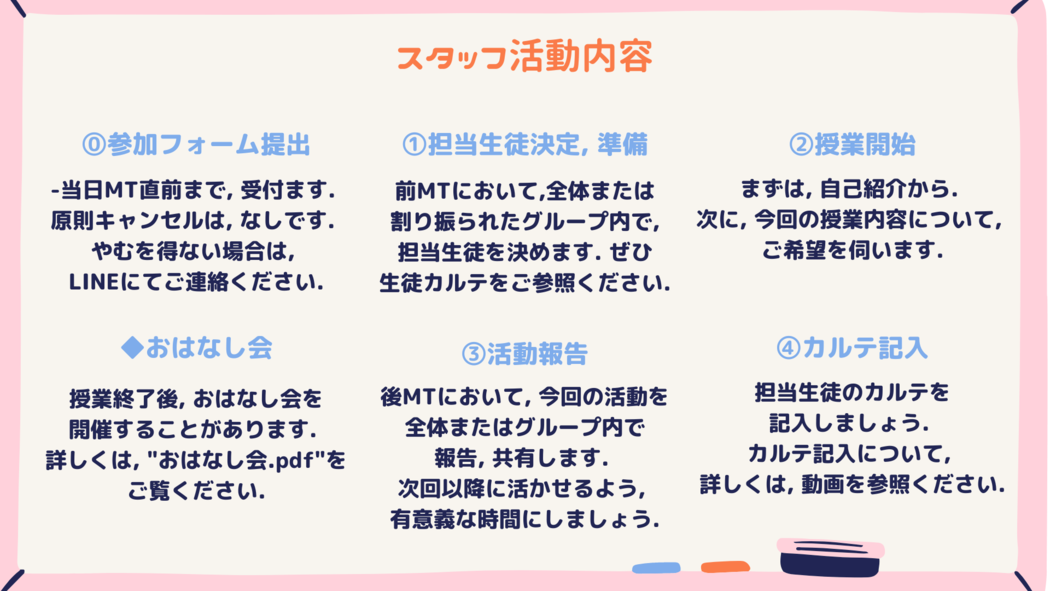 - ・活動内進行(Zoom開室, ブレイクアウトルーム作成 など)
