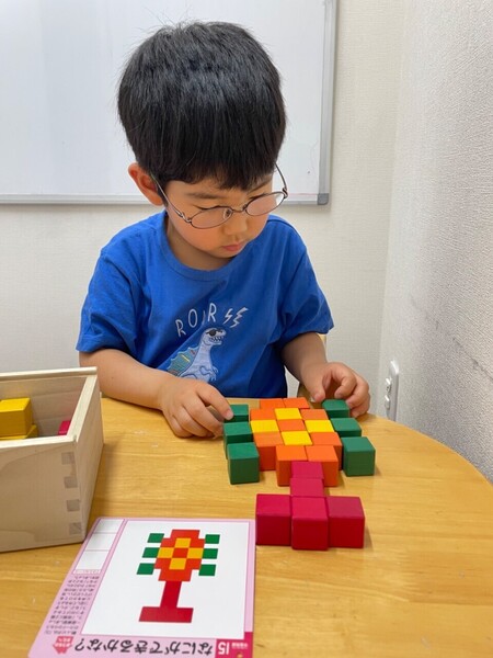 お子さんに合わせた課題内容を個別の時間に行い、そこで学んだ成果を小集団、そして幼稚園・保育園等の社会に生かしていくことができるよう、支援を行っています。