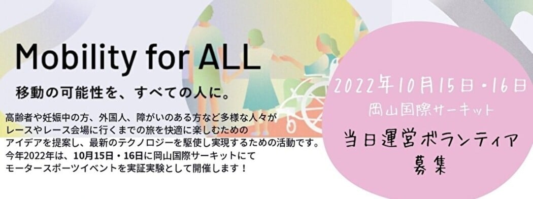 障がいのある方にもモータースポーツを楽しんでもらおうと、10月15日・16日に岡山国際サーキット(美作市)で行われる「スーパー耐久レース」にて実証実験を行います。当日運営ボランティアを募集しています!