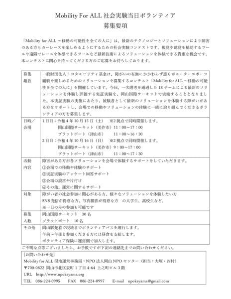 - 障がい者にもモータースポーツを~岡山国際サーキット実証実験運営ボランティア募集~