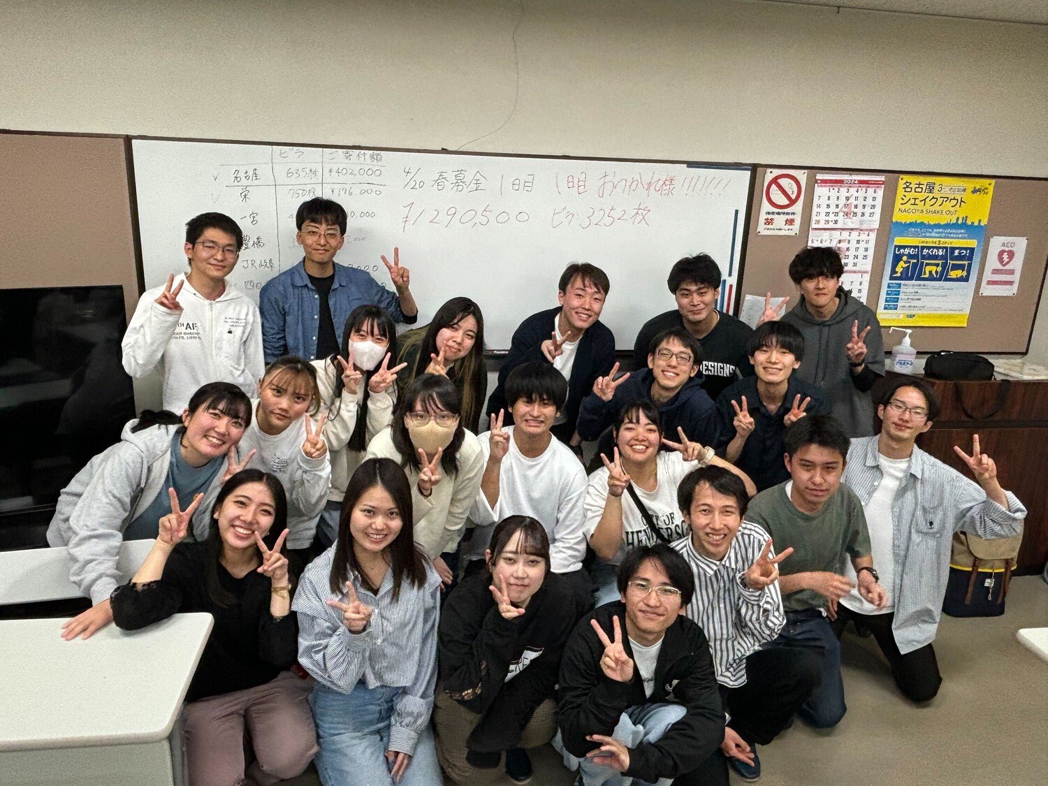 (写真は、雨の中でも挫けず金山駅で募金を行う局員の写真と、募金終了後に振り返りや片付けなどの作業を行うため、その作業場所で撮った写真です!)