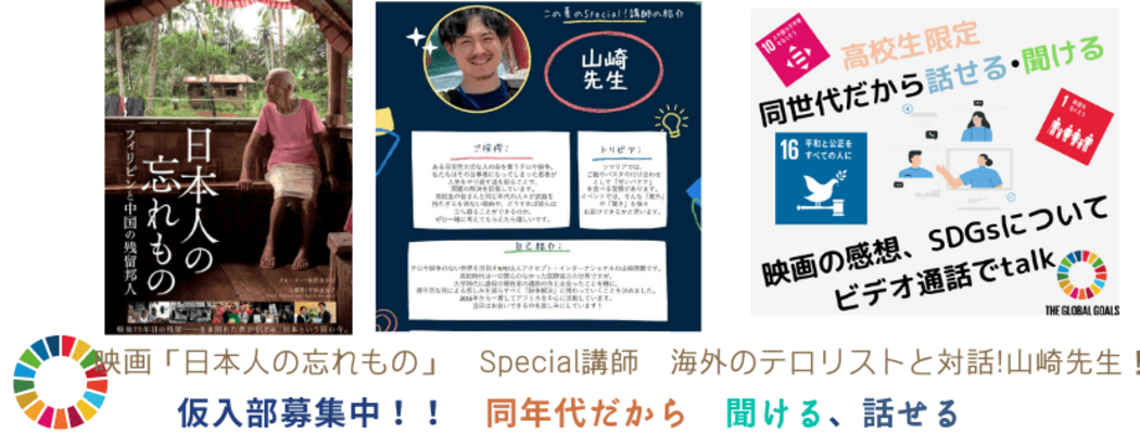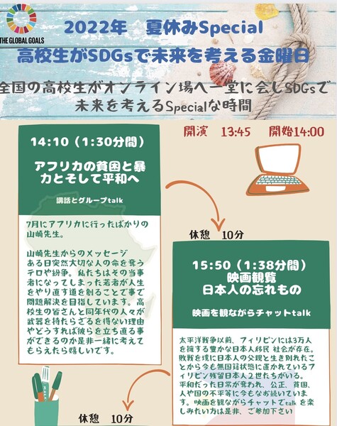 初心者歓迎。夏休み期間中にSDGsを探究したい方。映画と夏休みの特別講師を招いて高校生同士だから話せる、聞けるtalkあり。 |
