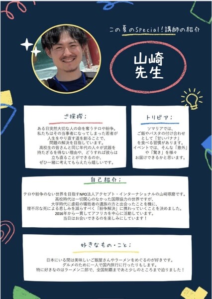 慶應義塾大学法学部政治学科卒業生で今人道支援をしている講師の話が聞けます。 |