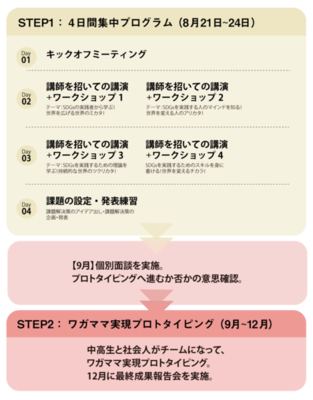 中高生が考えるワガママの実現を同世代や社会人と協力して「試作(プロトタイピング)」するSDGs実証プロジェクトです(8/21~12月)。自らが感じている社会課題や実践してみたい企画がある人歓迎!