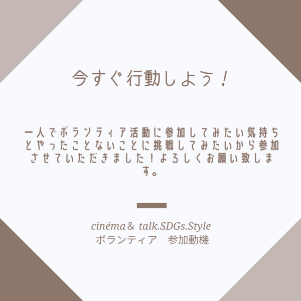現役、高校生、大学生等学生を中心に「SDGs17パートナーシップで目標を達成しよう」の呼びかけのもとに問題解決のヒントや今日からできる事を日々の暮らしを丁寧に大切にできる時間をつくりだします。
