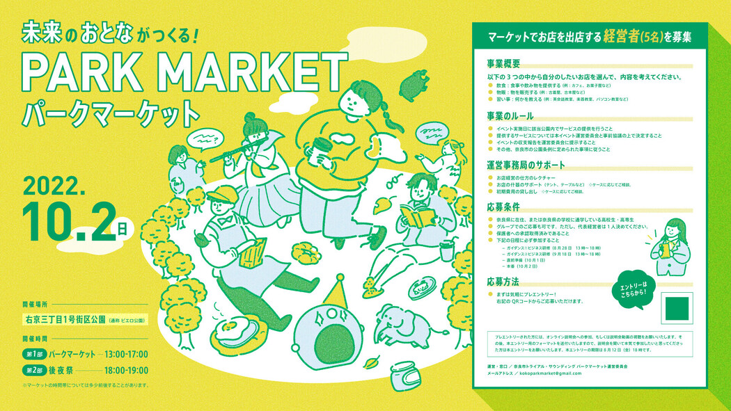 高校生、高専生の皆さん!奈良の公園で出店者になり、一緒にマーケットを作り上げませんか?飲食、物販、習い事から内容を選べます。自分のお店を経営してみたい方、奈良を盛り上げたい方はぜひ応募してください!