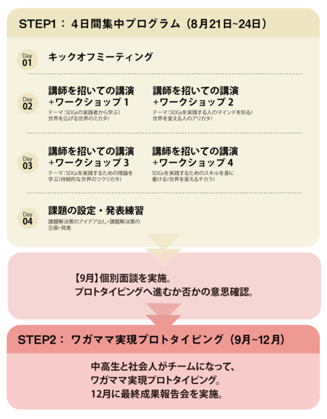 中高生が考えるワガママの実現を同世代や社会人と協力して「試作(プロトタイピング)」するSDGs実証プロジェクトです(8/21~12月)。