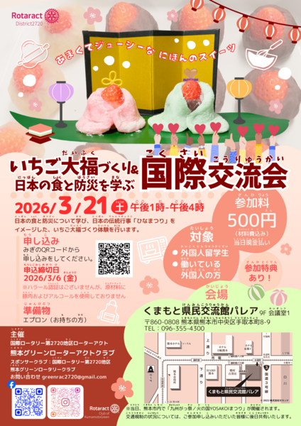 ・プログラム:食育防災アドバイザーを講師として、防災と食に関する卓話、いちご大福作り体験を行います。
