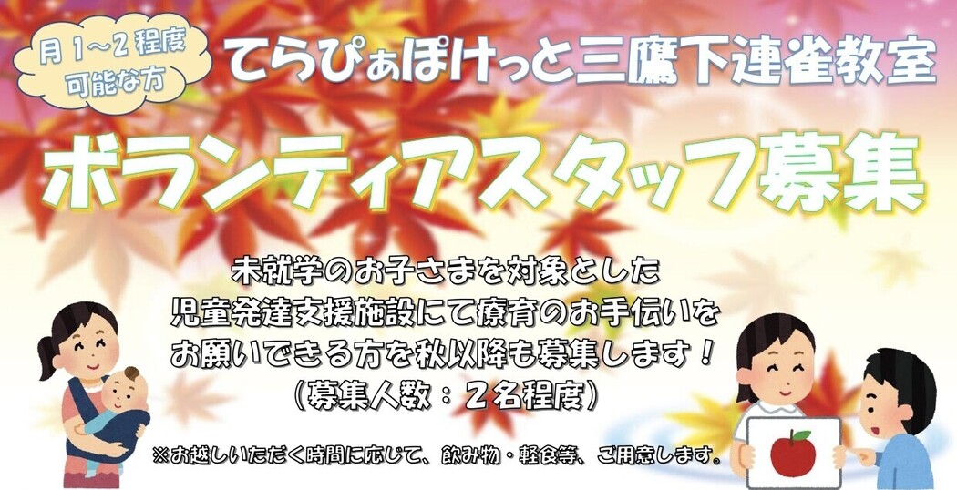 "てらぴぁぽけっと三鷹下連雀教室"では、定期的にボランティアとして活動に参加していただける方を募集しています。