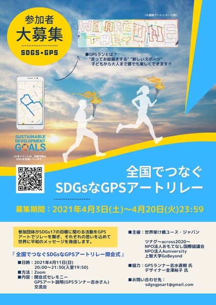 ゴミ拾いをしながらGPSランで平和をテーマにした作品をみんなで作ります!GPSランで各自(各団体)に割り振られた1文字または絵をそれぞれの場所で描き一つの作品にし、平和のメッセージを世界に発信します。