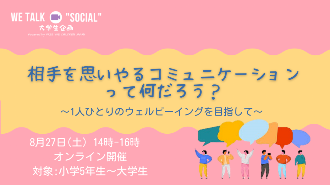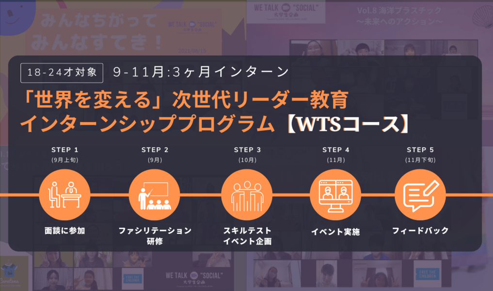 We Talk Social(WTS)コース(オンラインイベント企画)は、小学生から大学生までの様々な世代が参加して社会問題について学ぶイベントオンラインイベント「WE Talk "SOCIAL"(WTC)」の企画運営を行います。11月の開催を目標に、それぞれが取り組むイベントのテーマ探しからプログラムの構成、参加者の募集やケア、プレゼン資料の作成、司会進行など、一連のオンラインイベントの運営スキルを習得します。