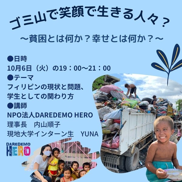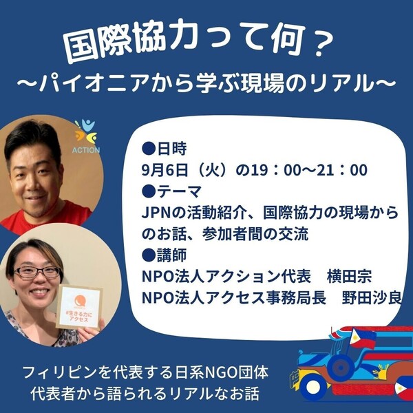 9月6日(火)19時から、フィリピンを拠点に活動する2つの団体から2名の講師、横田宗氏(NPO法人アクション 代表)、野田沙良氏(NPO法人アクセス-共生社会をめざす地球市民の会 事務局長)を招き、フィリピンや国際協力の活動・仕事との出会い、現状の活動等についてお話ししていただきます。