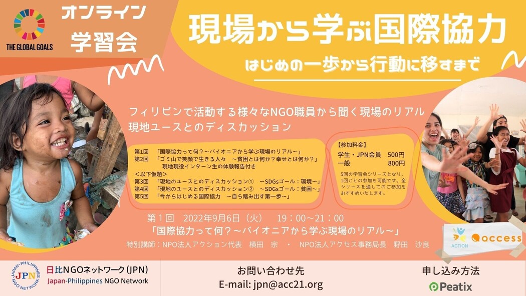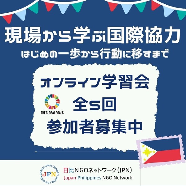 「国際協力の仕事ってどうしたら関われるの?」「NGO職員の人たちからみた現場のリアルって?」そんなことを考えたことはないですか?フィリピンで活動する日本のNGOのネットワーク「日比NGOネットワーク(JPN)」では、2022年9月から来年の2月にかけて、このような疑問に応える5回の学習会シリーズを企画しました。海外やスタディツアーに行くことが難しい現状ですが、フィリピンを拠点に活動するNGO団体の職員、現地のインターン生からの話を通して、少しでも現場のリアルに触れてみませんか?多様な国際協力のあり方を学び、そこに何か行動を移すことにつながるヒントがあるかもしれません。