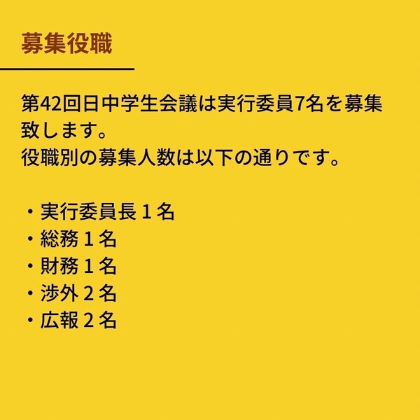 活動頻度:週0~1回 週1回ミーティングがあります。日程は42期委員の7名で決めてもらいます。8月の1か月間は日中学生会議の合宿に参加していただきます。そのほか、役職ごとに忙しい時期がございます。 |