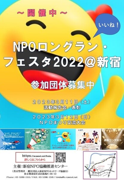 新宿NPOネットワーク協議会が主催する『NPOロングラン・フェスタ2022@新宿』は2023年3月まで実施している“まつり”イベントです。各分野の専門家に情報や知見を提供してもらうビックチャンスです。