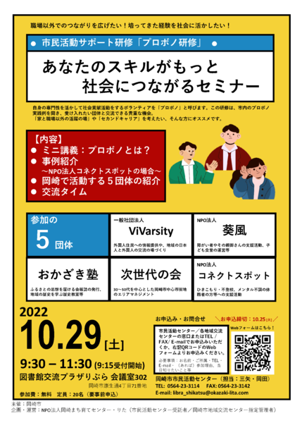 今後プロボノとして自身の専門性を活かしたい方向けの基礎的な研修の受講者を募集します。愛知県岡崎市内のプロボノ実践例を聞き、受け入れたい団体と交流できる貴重な機会です!