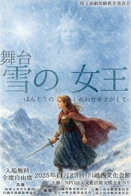 2025年10月30日~11月3日に埼玉県川越市で埼玉演劇体験教室発表会 舞台「雪の女王」が行われます。そこで公演ボランティアスタッフを募集しております。観劇も併せて出来ますので、是非ご参加ください!